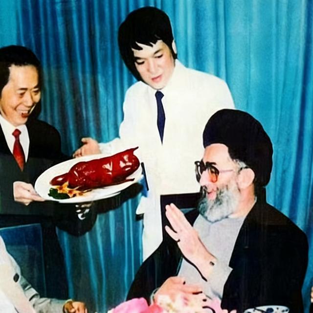 我们现在看到的这一张照片拍摄于1989年5月,地点就在北京全聚德和平门烤鸭店内。当时的哈梅内伊,还不是伊朗最高领袖,而是以伊朗总统的身份,正式对中国进行国事访问。